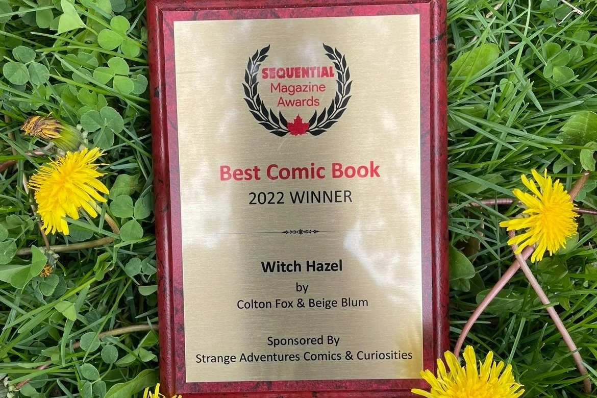 Witch Hazel was awarded Best Canadian Comic of 2022 and Jessica Huynh was awarded Best Colourist for her work on Witch Hazel. Strange Adventures Comics & Curiosities in Halifax produced amazing plaques that Colton and Beige are proud to own.